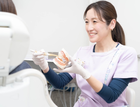 事前説明ではアニメーションや模型を使い、視覚的にも分かりやすくお伝えいたします。また、鏡を用いて患者さまと一緒に口内環境の確認もしています。