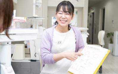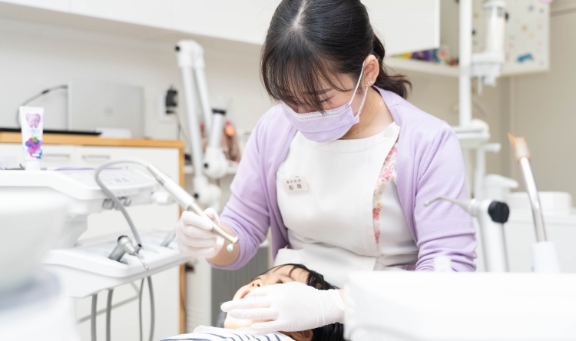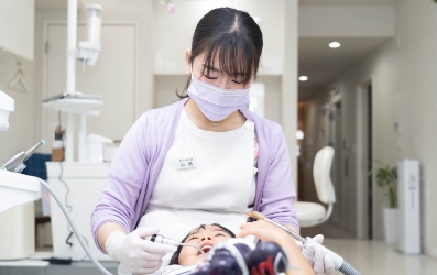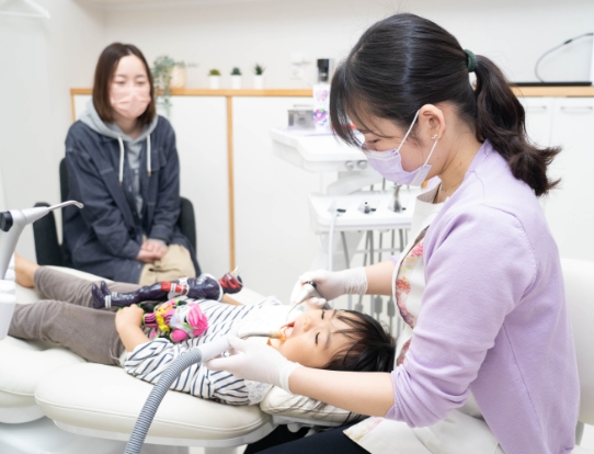 お子さまの診療時は親御さまも一緒に診療台に来ていただき、お子さまの不安を取り除くとともに歯磨きの仕方や食育のアドバイスなどをお伝えします。