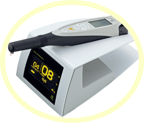 ダイアグノデント ペンは、歯面に655nm のレーザー光を照射することで起こる蛍光反射を測定し隠れたむし歯を検出します。カリエス(むし歯)検出率90%という高い確率で発見することができるため、 視診やX線で発見できないようなカリエスも診断結果に基づき、健常歯を保持する適切な治療計画を立てる事ができます。