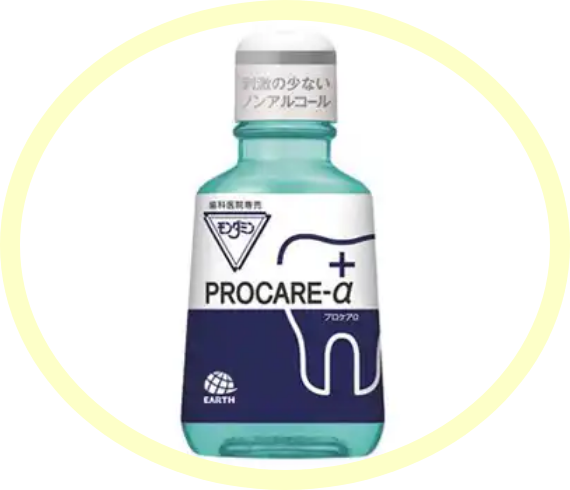 当院では「プロケアα」という歯科医院でしか買えない洗口液をおすすめしています。「プロケアα」は医療現場の声から生まれたプロユース向けの商品で、3つの薬用成分をバランスよく配合したプロ仕様の洗口液になります。