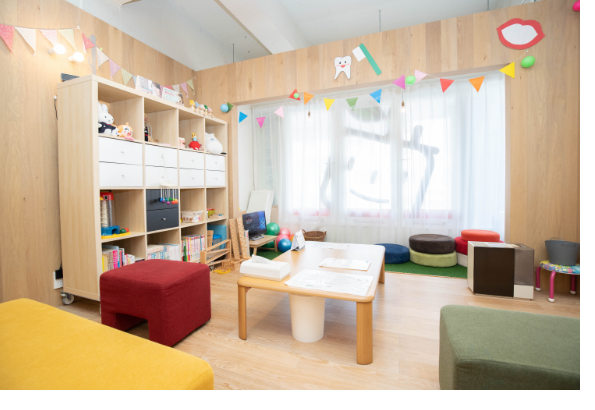 院内にはキッズスペースを備え、愉快な音楽とおもちゃで楽しく待つことができます。診療室にもぬいぐるみを置いていたり、チェアを仕切るロールスクリーンにはキャラクターが描かれていたりと恐怖心を軽減させる工夫をしています。